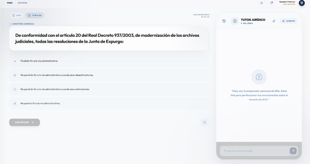 Descarga gratuitaHoy, oposiciones judiciales. Mañana, mucho más. En un futuro no muy lejano iremos incorporando todas las oposiciones de España con la misma metodología de IA.